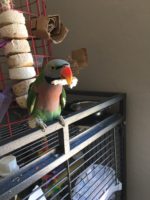 Mustache parakeet. Green bird with pink chest. Black line between eyes and mustache by beak.
