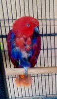 Porcha is a female eclectus and she is my nice bird and she has been in the family for 4 years. My nice Jacky went out of town on vacation and left me her bird for 2 weeks. She is coming home tomorrow and I am here drowning in rivers of tears. Porcha is like a daughter to my nice and I can’t imagine what is going to happen tomorrow when she arrives and see’s that her baby is gone. Porcha is a typical eclectus for those who don’t know all females have a red head and red and blue on their wings, the body is mostly blue but she has plucked the feathers from her breast area, her tail has some orange in it and her wings are not clipped. She is very loving and usually can be handled. She may bite if she gets nervous. She says mom often and may say her name or pretty, pretty birdie. She doesn’t really like water, and she isn’t crazy about green foods. I have some beads I play with her with and she really likes the orange ones, I think that is her favorite color. I can’t express how broken hearted I am. Please if anyone can help me it would mean the world to me… we are also offering a reward.