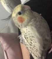 Very curious but very easily scared. Has never been outside. Likes to land on heads, shoulders and buttocks. BAND ID SBxxx.Owner will supply complete information.
