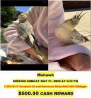 $500 CASH REWARD to help us find our cockatiel Mohawk. On 6/31/20 3:30pm he flew away from corner of Norwood Rd. and Wendover towards Coldspring Dr Bloomfield Hills MI. He’s never been out and 2 years old.He trusts human and will perch on your shoulder or eat of your hand. His feathers and claws are fully grown. He responds to his name and very intelligent. He recognizes my voice and screams. I am so broken up about him. Thank you so much my email: maynajem@hotmail.com phone: 248-613-3930