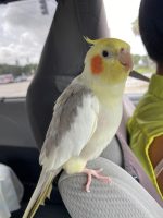 Buddy is a friendly bird, will walk up to humans, and step up on your hands. He is a pied cockatiel with pale grey, yellow, and white on his wings, body, and face.