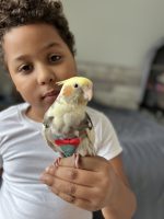 6 month old cockatiel. Likes to fly on shoulders and groom your hair. A bit spicy in personality. Can be very talkative.