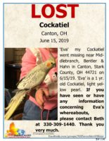 ‘Eva’ my Cockatiel went missing near Middlebranch, Bentler & Hahn in Canton, Stark County, OH 44721 on 6/15/19.