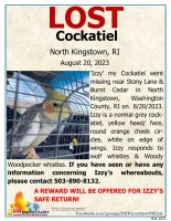 Our very beloved Cockatiel named Izzy flew out the front door yesterday evening (Aug 20). We live near the intersection of Stony Lane and Burnt Cedar in NK. He is most likely perching somewhere low to the ground, maybe a small tree or bush.