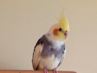 Our cockatiel Rosie is white, with rosy orange cheeks, grey and white chest with yellow tail feather. She is 1 year old. She responds to cat whistles and calling her name. She is hand trained but a bit skittish when scared.