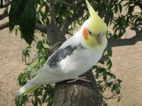 Polly is a very happy and usually friendly boy who loves to whistle, especially mimicking a telephone. Polly also loves scratches. He has never had his wing cut as he always stays with us, even if he flies off he will always come back. He is not a cage bird and will protest loudly when put in one. I love him dearly and I have had him for about 9 years now. It seems I am his mate also.