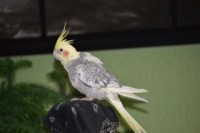 Young Cockatiel flew out our back patio. He was quite tame buy not fully trained to his name. He is mostly yellow in colour with grey and white patterns on his wings and rosy cheeks.