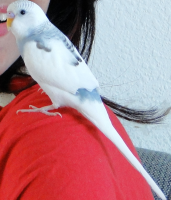Its a white parakeet, budgie. It has a single black mole/ feather on its chin (looks like Robert d Niro). It flew away from Prairie Stream way, Columbus, IN. It is very friendly and loves to interact with people. It can say its name “Tilu”.