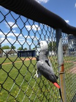 Her name is Janzy. She is a one year old African Grey. She is banded. Her eyes are stille grey because she is young. She may still have some partly clipped feathers. Her most common sounds are some Super Mario tunes. She is very and will most likely step up on your hand if you approached her.