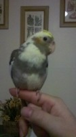 Pebbles is a male cockatiel with gray wings (white lower portion) and a mix of a gray/white/yellow body with bright orange cheeks. His beak and feet are pink. He is quite vocal and can say phrases like, “where’s the birdie,” and, “wee!.” He also whistles and loves looking in the mirror. He is very hand tame but since his wings aren’t clipped he can fly very well.