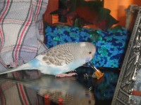He is a sky blue and grey parakeet. He is pretty friendly. He flew away just saturday and we havnt been able to locate him. He loves seeds.. and if you have anything with bells.. he also likes playing those.. so maybe the sound can attract him. He will come to your finger if you spot him and try and go near and pick him up on your finger. If there is any information or location pleasee do contact me. my email is mansi1219-at-yahoo.com. Thank youu!!