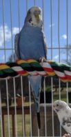 Blue is about a year old male parakeet. We adopted him with a broken right wing that had since healed, but still shakes. Blue is young and still timid around people. He has a tiny black spot on the back of his head. We will supply complete band I formation if found.