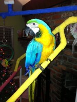 This bird is only 4 months old. His eyes are not yet black and is very friendly with people. His escape was his very first trip outside. He has a band on his ankle.