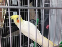 Lutino cockatiel, yellow head, orange cheeks, rest of body is white. He often makes a wolf whistle, and a loud clicking noise.
