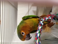 Rootbeer can make a number of animal sounds, including meow and quack, and the sound that Sandhill Cranes make. He can also beep, make a kissing sound, and approximate his name. One of his back toes is slightly curled. He does not like men very much.
