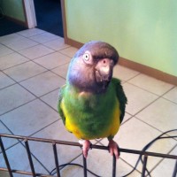 Lulu will fy and land on your shoulder and sit there as long as you let her. She is very good about “stepping up” on your finger. Lulu loves to have her head scratched and will put her head down so you can scratch the back of her head. She likes to sit on my shoulder when I’m eating and often puts her head around to the front of my face. This is her way of saying she wants some of whatever you are feeding her. She is very friendly and knows her name. She flew out an open door as we had not clipped her wings in a while.