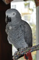 Domingo says “hello”, meows, barks, sings, and laughs. He has a deformed toe on his left foot. He has one gray feather in red tail (see picture).