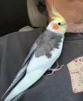 Cockateil “Pipo” is gray with white , white head , yellow crest ,orange circle on the cheeks.
