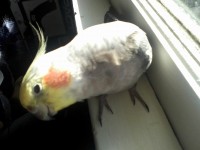 Hiroko is your typical grey cockatiel. Yellow face, orange cheeks, yellow green mohawk crest, and white tipped wings. He may be injured, for we last saw him being chased by a crow, but escaped. He is a sweet boy, may act mean, act like he’d bite ya, but unless something is wrong, he’ll only aggressively lick your finger.