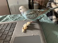 He’s light blue- loves millet – loves to jump on my hand, head or plate to eat what Im eating