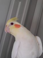 Cautious around strangers but not really shy. Loves millet. Body is completely white (with a little yellow tint sometimes), the only significant color are the cheeks, which are orange. (And red eyes.)