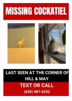 She is very friendly and mostly yellow with some grey and bright red spots on her cheeks. Normal looking cockatiel who was last seen around Hill and May Avenue September 15.