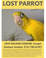 Our beloved Golden Conure flew off on Thursday, March 21st in the afternoon and is believed to have been heading East on Community Ave in NW Port Charlotte. She is only 6 months old and completely friendly, she may respond to her name, Seraph. She has some black spots on her beak not in the pic. If you see her just talk to her nicely and she should approach you, she loves pecans and pistachios best. If you have any info please contact us, she is our baby, our hearts our broken. Thank you