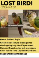 My baby Soph flew out on November 26 2020. Motif Apartment Homes is where it happened. W cactus rd. Right off highway 17, cross streets Sand Lilly/ N25th Ave. Cave creek park is fairly large an is right next to the backside of the apartments. He was seen on W Lupine Ave & N 24th Ave yesterday top of a telephone pole. He seems to keep getting spoked an moved further away. He is flying back an forth back to the park as well. Mr. Soph is a screamer. He responds to “Soph” whistles, clicking your tongue or making kissing noises. He likes bells also. If you do see him an can get close enough to offer him a treat he loves dried cranberries, almonds, and carrots. Bob Marley’s songs “three little birds or one love” might get his attention an be very vocal while the the songs were playing.