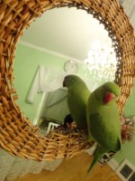 He’s a green ring-neck parrot with a black ring surrounded by a bit of red on the sides and has a red beak.