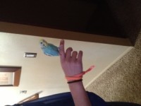 He was last seen flying away from the Sandpoint marina docks. Has a yellow head with a blue belly and back. Wings not clipped. Blue banded beak. Two spots underneath his eye. Has pink feet. Has a band number on his left leg.