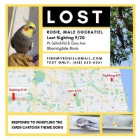 Lost since 8/25 at 5:30am. Male normal grey cockatiel named Rosie was lost near Motel 6 on the south-side/Schiller, near O’Hare. Responds to whistling.