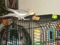 Jewels has all the features of a Grey Normal Cockatiel (Yellow, Grey, and White). One of her distinguished features is she has crooked tail feathers. She is very friendly, talks a lot, and loves other animals. The yellow on her head is very light, but the orange on her cheeks is bright. She has white on the lower part of her wings. She is also smaller than normal size cockatiels.