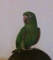 He is all green, with round white circles on his eyes. He has some red under his belly scattered in the wings and edges. He is noticeable because he has a unique feature. He has a broken beak, it looks cracked. He isa medium sized parrot.