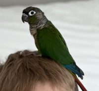 She’s a Green-cheeked Conure with a pink metal leg band (with ID number).