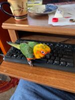 The Parrot’s name is Romeo and he is a Jenday Conure. He has a green body with orange/yellow chest and a bright orange/yellow head. He has a very loud squawk and was last seen up high in a tree across from 2345 Kenlee Drive on 05/13/2021.