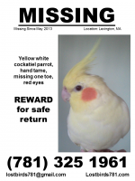 Yellow white cockatiel parrot, hand tame, missing one toe, red eyes