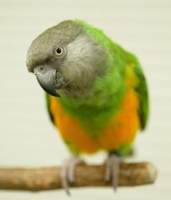 He is a senegal parrot, green with a yellowish orange belly and a gray head. He is friendly and will step up, but approach him calmly.