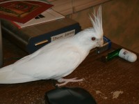 Cloud is a 3 year old albino cockatiel. Responds to “pretty boy” and the come-here whistle, “phweet-phew”. He is pure white with red eyes.