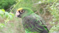 Walter is green and black with a yellow orange crown. He is almost 10 years old. He says Hey Baby and some Hey Pretty Baby. He does not say too much else. Loves music. He likes to sit in an orange blossom tree. Also loves his little box when he is outside.