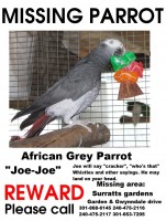 Joe will mimic noises and loved crackers. He may land on you head if you are eating and if you make a train noise he will “choo-cjhoo” back. Words he will say on regular basis are “cracker”, “bad Joe”, whatca doing”, “pika-chu”…and whistles. Joe was last seen in Surratts garden area… Gwynndale Dr, Garden Dr, Piscataway Rd, and housing complex off of Hardesty Dr.