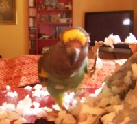 Rolybird says his name. He is frightened of people he doesn’t know, but if he is desperate and frightened enough, he may fly to someone and land on their head or shoulder. This is my last hope, that he became desperate enough to go to someone, who has taken him in. It is bitterly cold outside and he does not know how to find food or warmth, as he has never been oustide before. I pray that someone has found him and taken him in. He is missing two toenails, one on each foot.