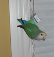 Colors: He is very colorful on the body- irridescent green and blue feathers. His face is pale yellow with a small peach area over his beak area. Moxy is a very sleek, handsome little guy.