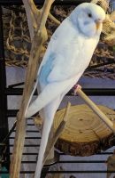 Cloud is an all white female budgie with a small amount of blue on her back by her tail.