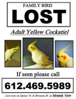 Adult all yellow Cockatiel. Escaped in Mounds View, MN on 9/10/2018. He is very skittish and wings are not clipped. Please call if he’s seen! 612-469-5989