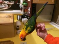 She is a sunday conure, about 7 years old. Generally very sweet, although she does bite. She is orange and green mostly.