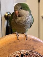 Green with grey chest. Left side of neck has clumped feathers. Name is Chico. Likes crackers & bananas