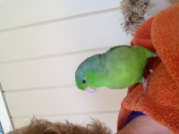 Mostly green parrotlet with blue under wings. Wings are not clipped and can fly well.