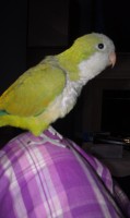 Merlin is a green Quaker parrot. He is 2 and a half years old and does not talk yet. He has a bald spot on his chest from plucking his feathers. Merlin loves to cuddle and make kissing noises. He is more comfortable with men rather than women. If you find him, please bring him home.