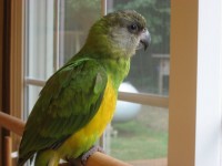 He/she has a red band on his right leg. He is shy, does not talk but can mock a door chime sound from a security system.