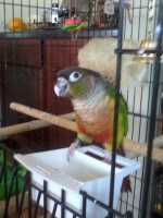 Ruby Tuesday is a very friendly bird she loves to dance and sing. She loves to cuddle and will even cuddle up and she with me.She has a bright green body with blue and red wing and tail feathers her belly is red yellow and orange and she has yellow red and white ariund her eyes. Her beeck is long and sharp she doesn’t like to use her cuddles. She dislikes corn and dates she will throw them at you. But she love papaya. I love andmiss her very much she is like my baby!